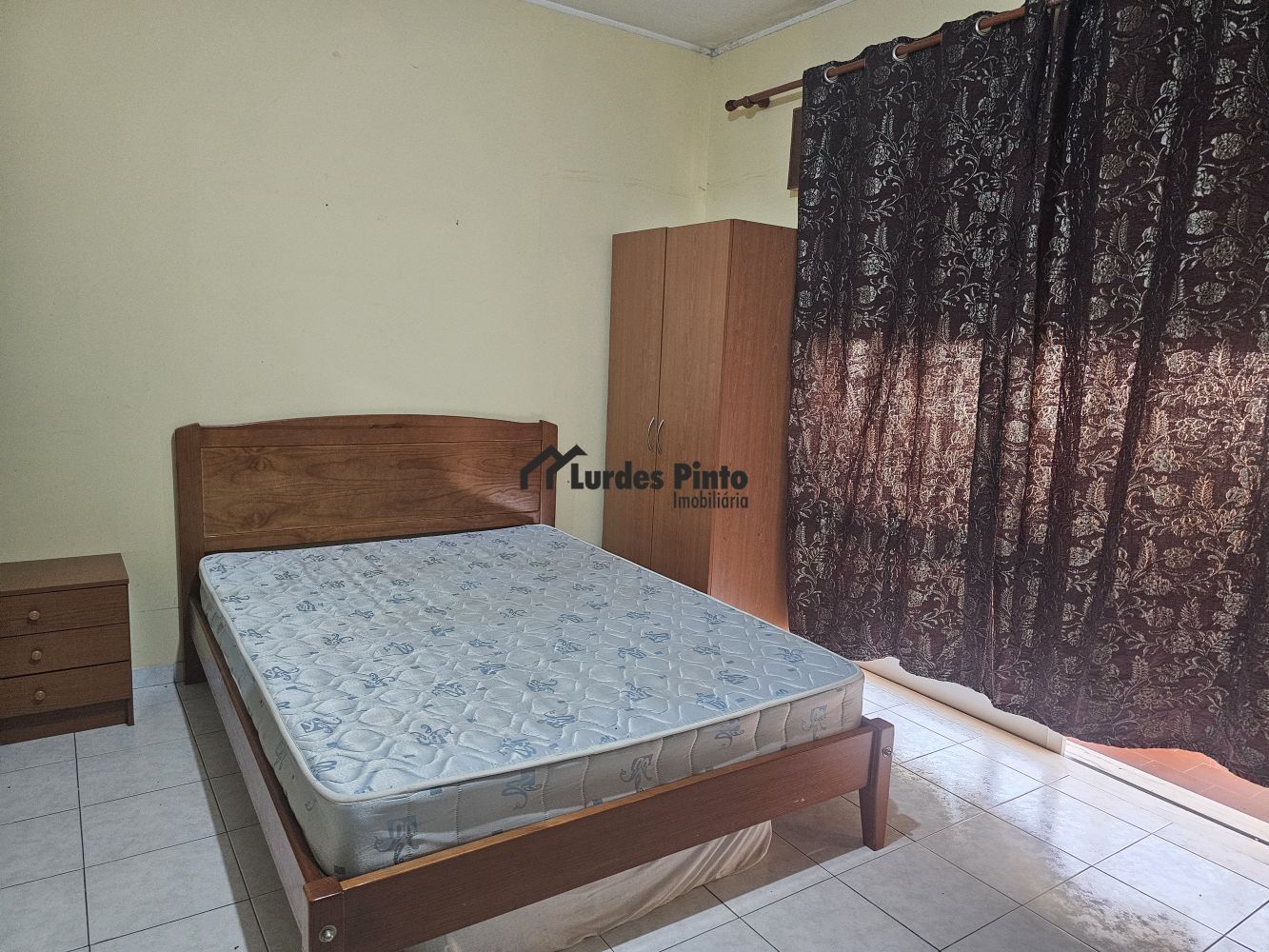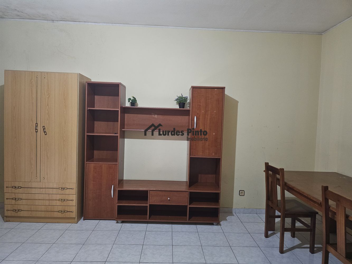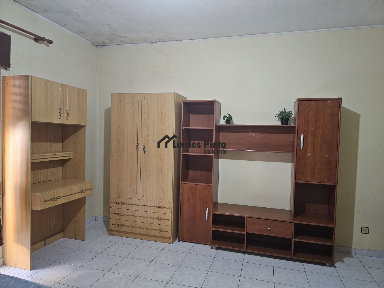 O quarto está mobilado com cama de casal, mesinha de cabeceira, dois roupeiros, secretária com estante, estante de televisão, sofá, frigorífico e mesa grande de refeições;