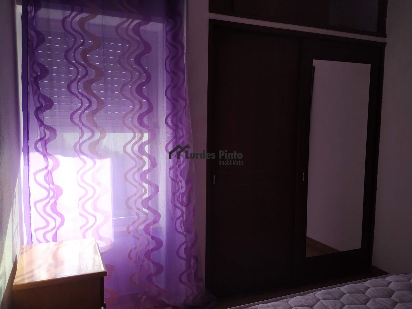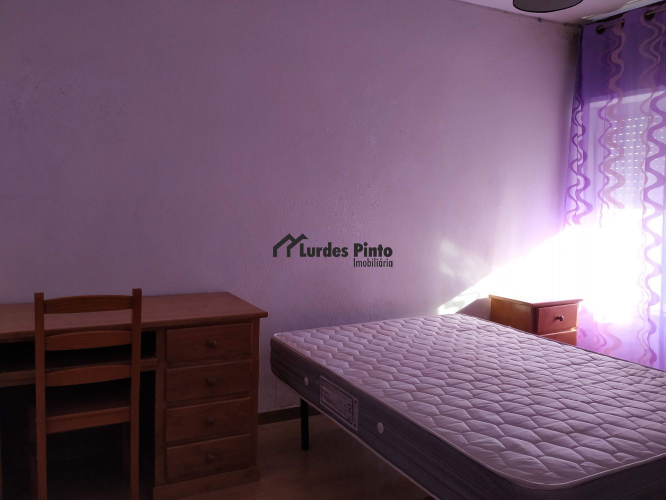 O quarto dispõe de cama, mesinha de cabeceira, secretária, cadeira e um grande roupeiros;