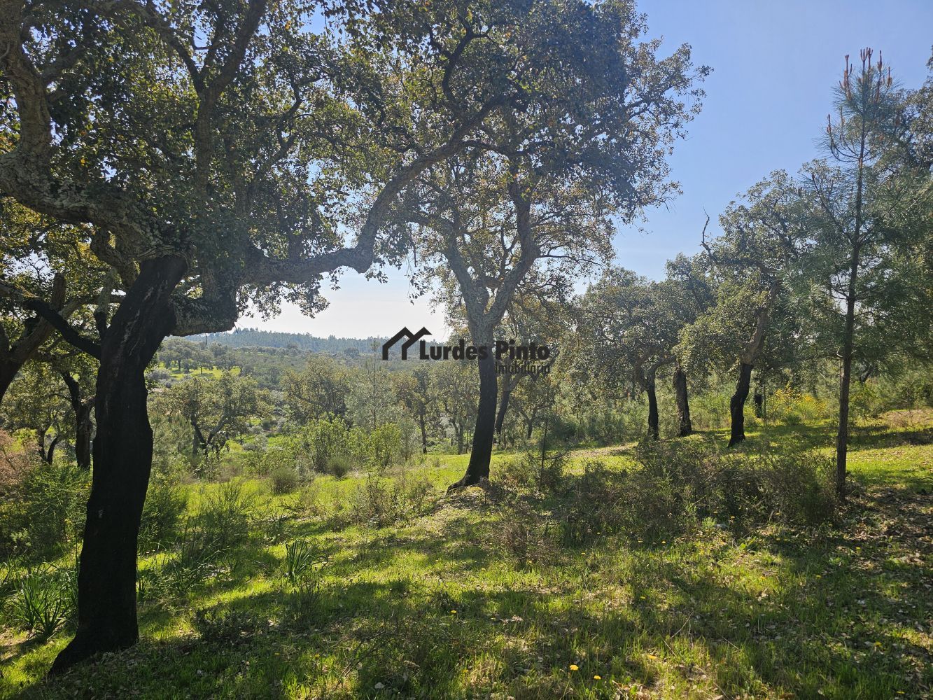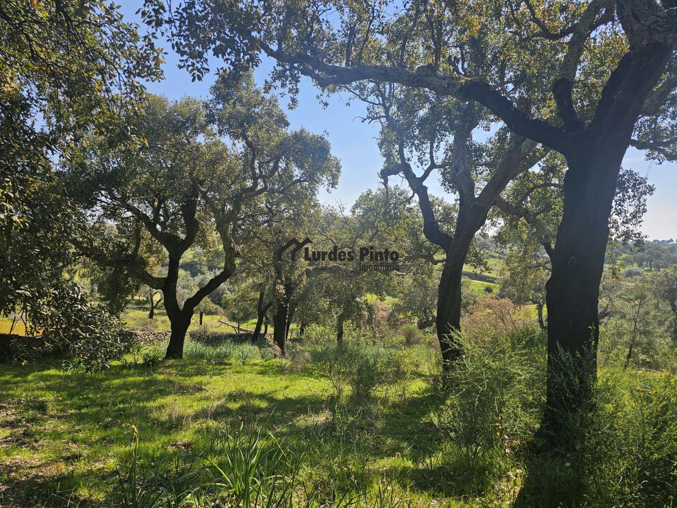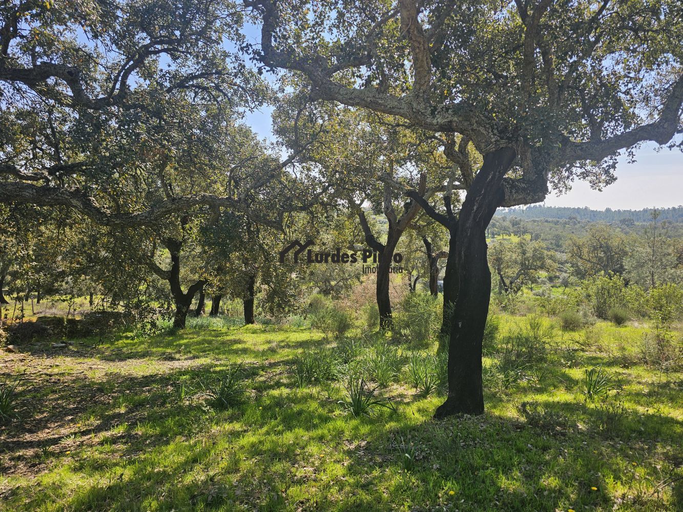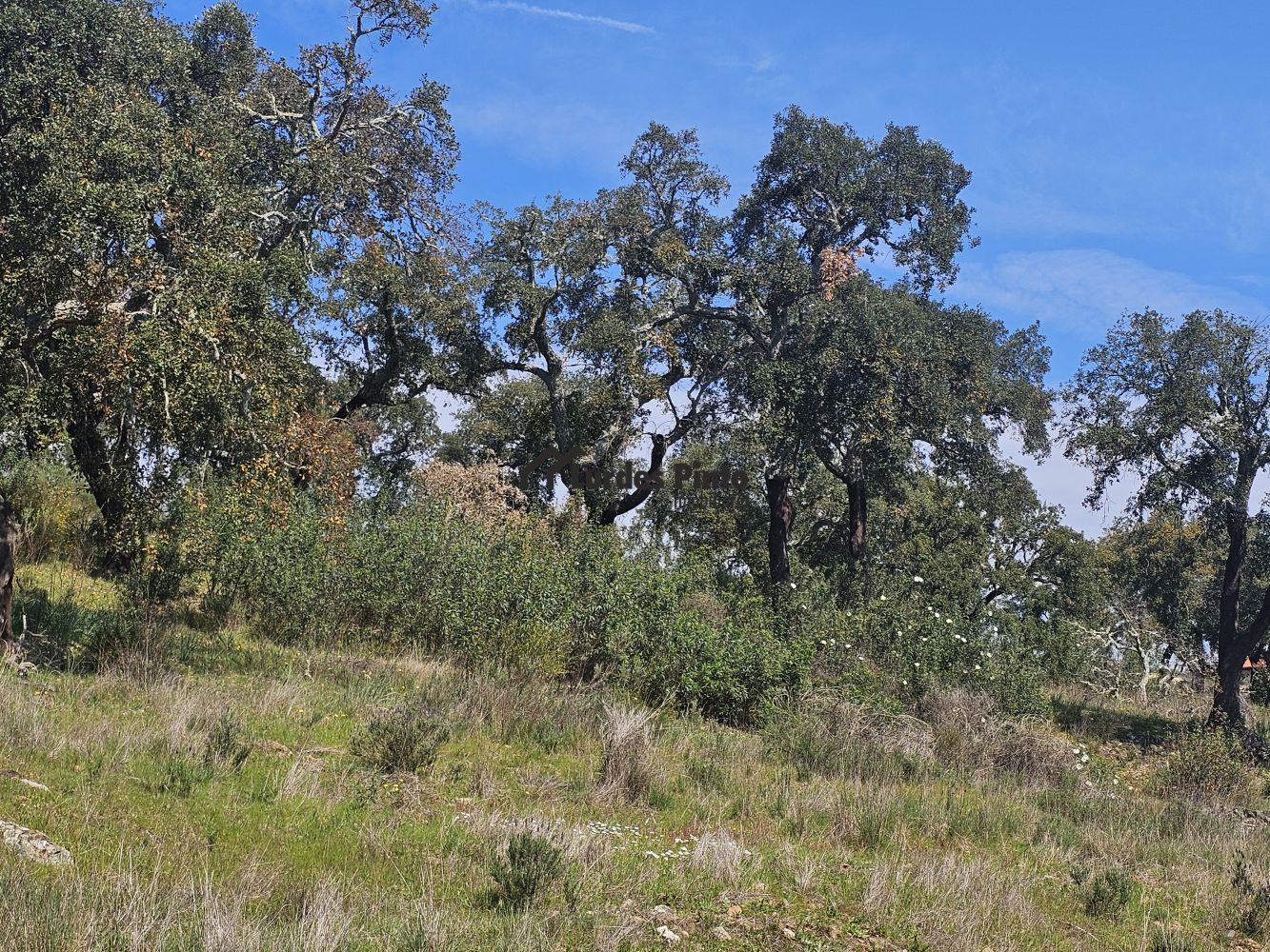 O restante terreno tem algum declive (não muito acentuado) e é povoado por cerca de 60 sobreiros adultos, com boa produção de cortiça;