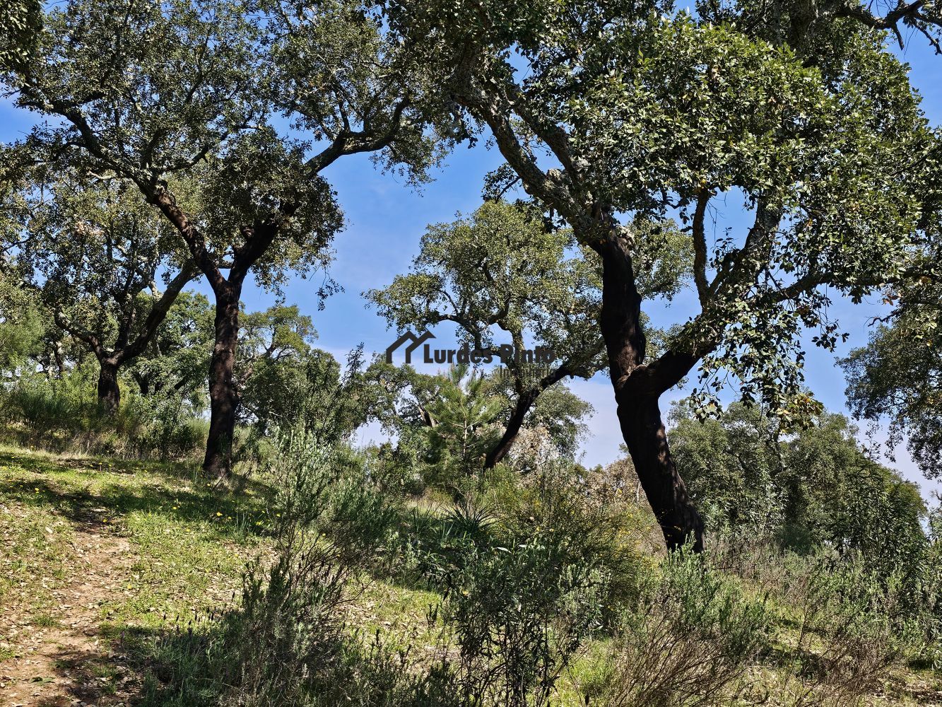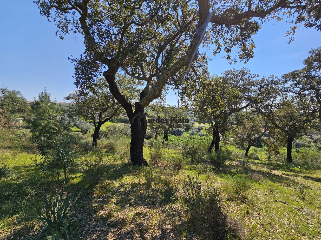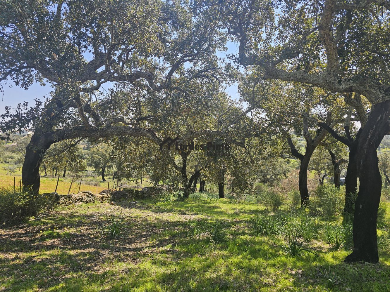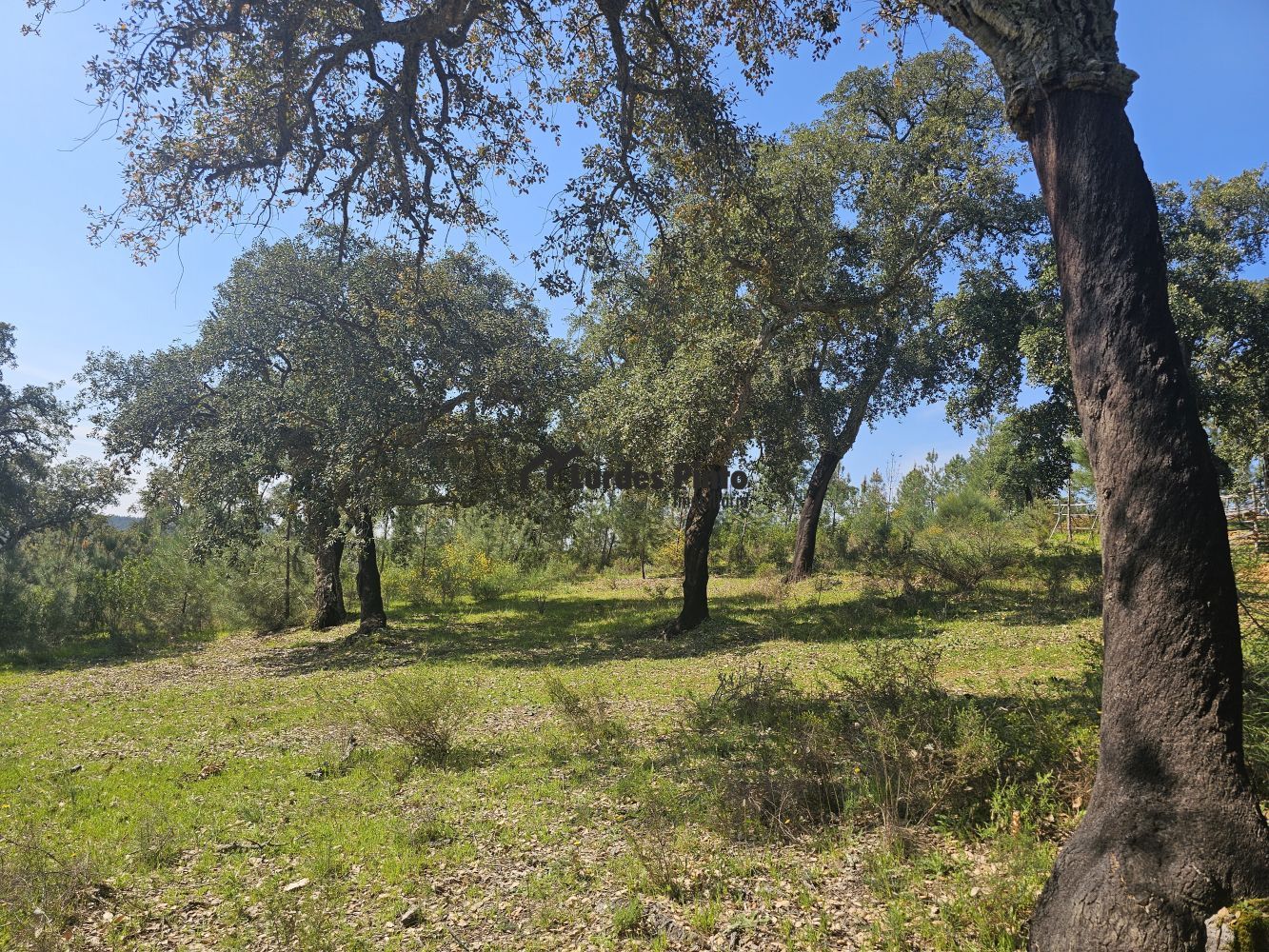 O restante terreno tem algum declive (não muito acentuado) e é povoado por cerca de 60 sobreiros adultos, com boa produção de cortiça;