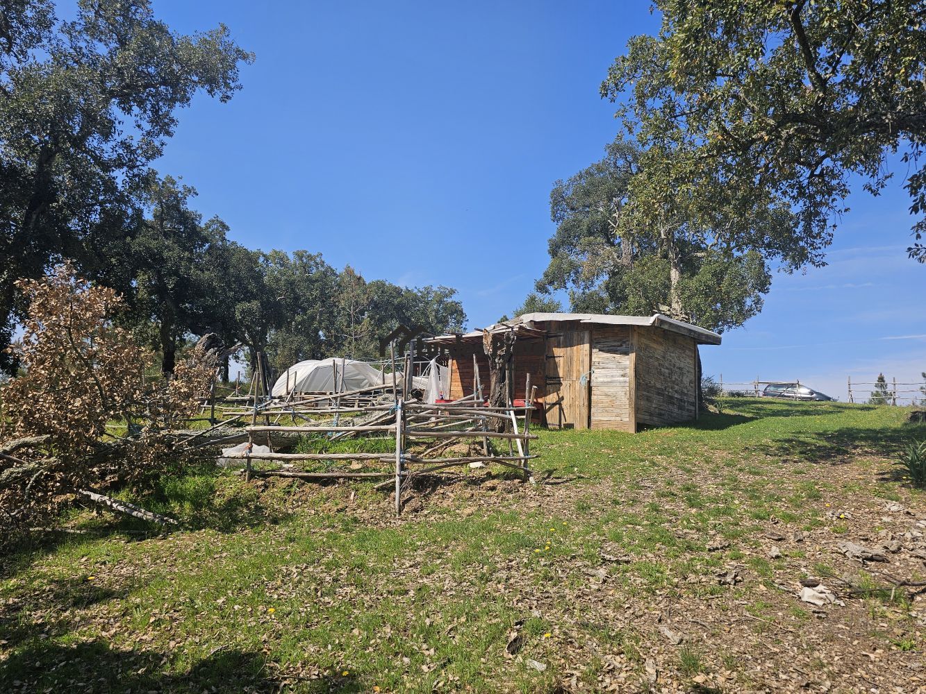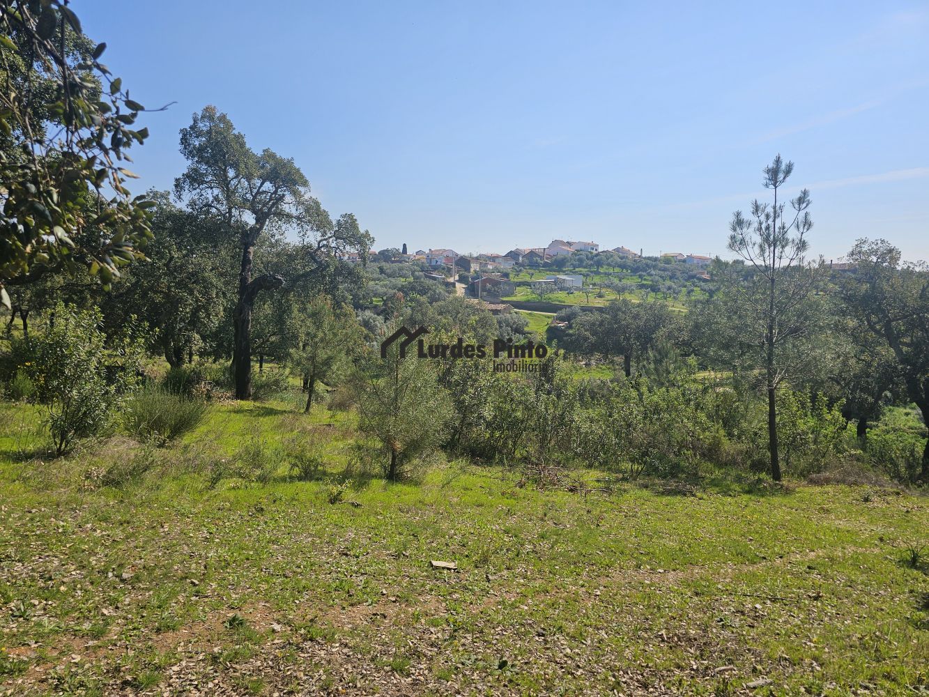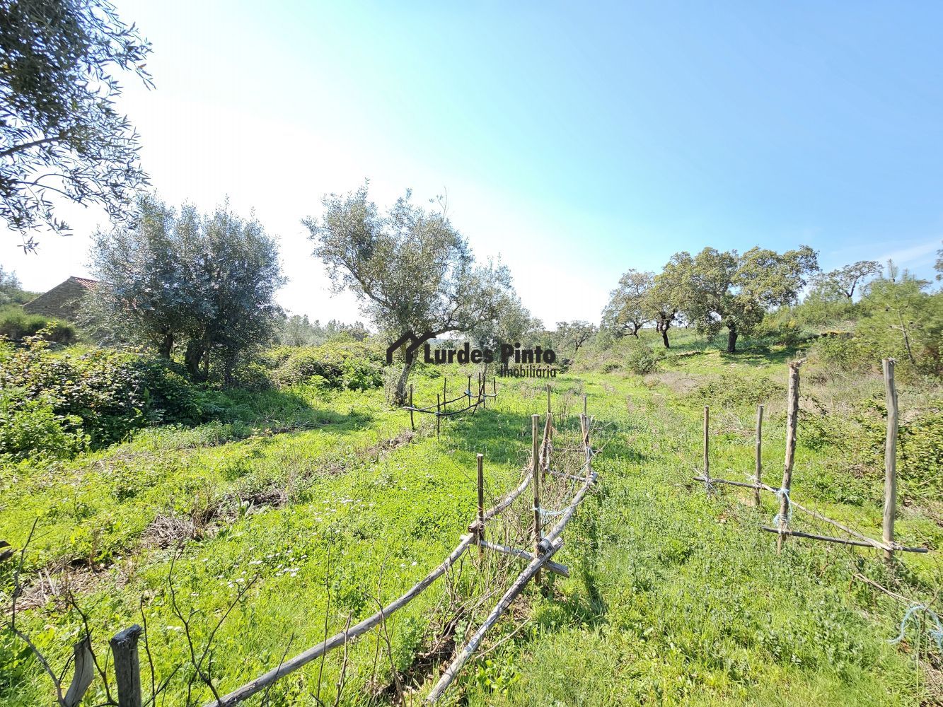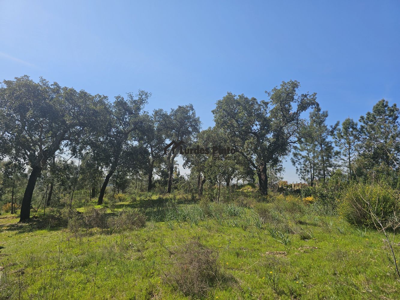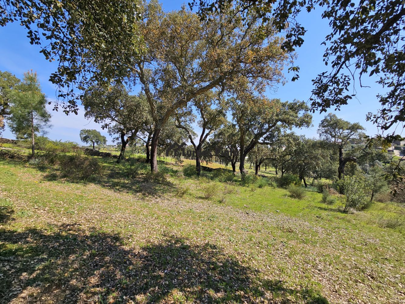 O restante terreno tem algum declive (não muito acentuado) e é povoado por cerca de 60 sobreiros adultos, com boa produção de cortiça;