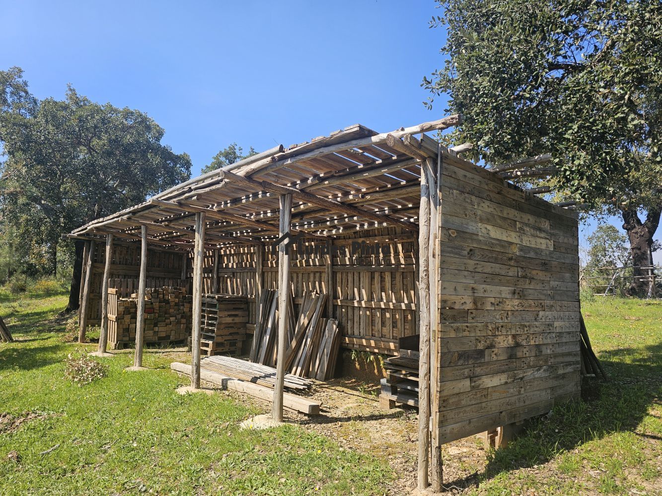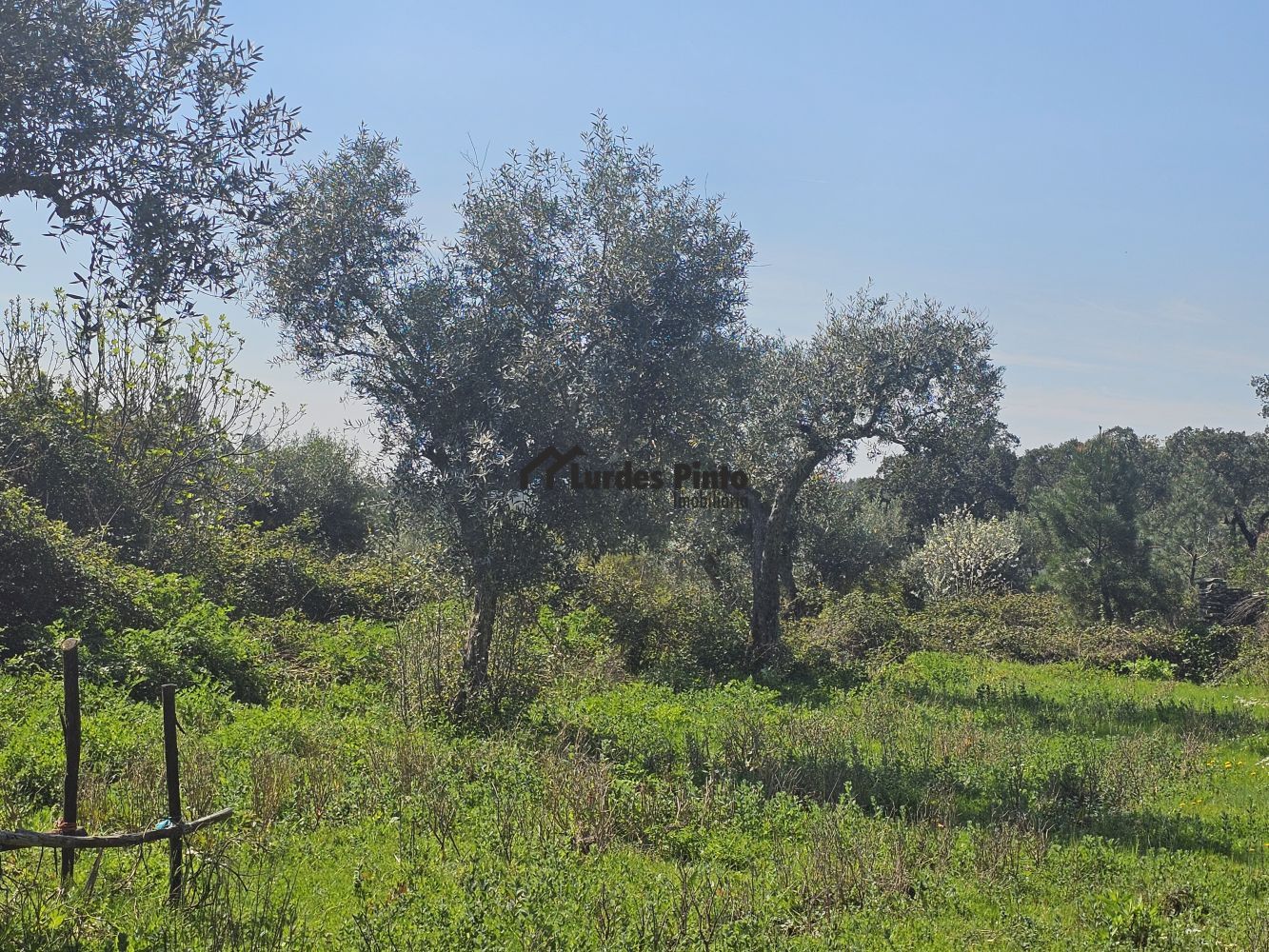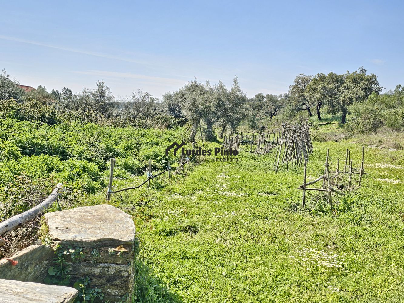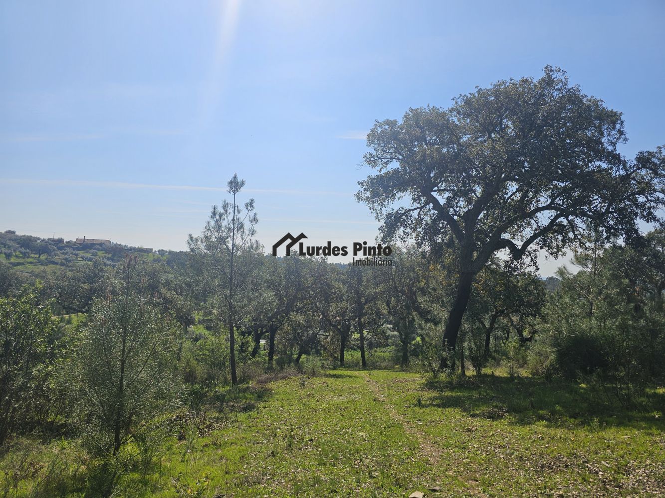 O restante terreno tem algum declive (não muito acentuado) e é povoado por cerca de 60 sobreiros adultos, com boa produção de cortiça;